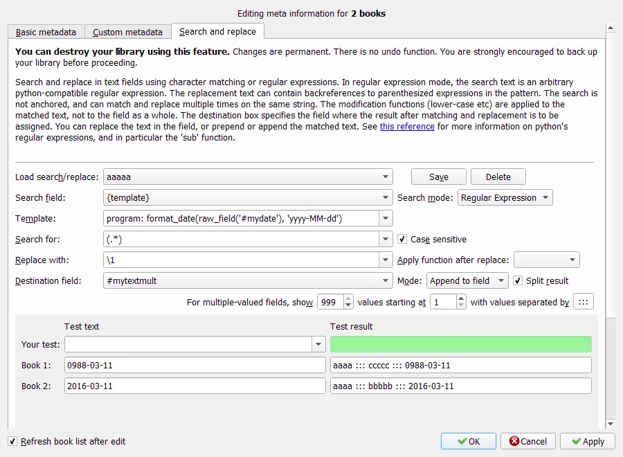 So I am looking for a Bulk MDE S&R definition to clear a custom date =============== Has anyone any thoughts on how I could get calibre to support lists of dates? I assume it can't be done without major effort. So, my idea is to convert a date value into a YYYY-MM-DD formatted string and store that in a tag-like value. Should I ever want use any arithmetic or date template functions I would have to reconvert the strings back to dates. So the question is - can someone furnish a Bulk MDE definition that will convert a custom date value into to a 'YYYY-MM-DD' string and append it to a custom tag-like value. I would name the definition c_save_date ================ So now I would have the following definitions -- a_move_date, b_counter++, c_save_date, d_clear date -- that I would execute consecutively in that order. Failure to execute the definitions in the right order, or inadvertently skipping a step, could result in data loss. So, it would be useful if I could put those four definitions into a group and execute the group in a single operation, anyone have any thoughts on that? BR Last edited by BetterRed; 09-14-2016 at 07:33 AM. |