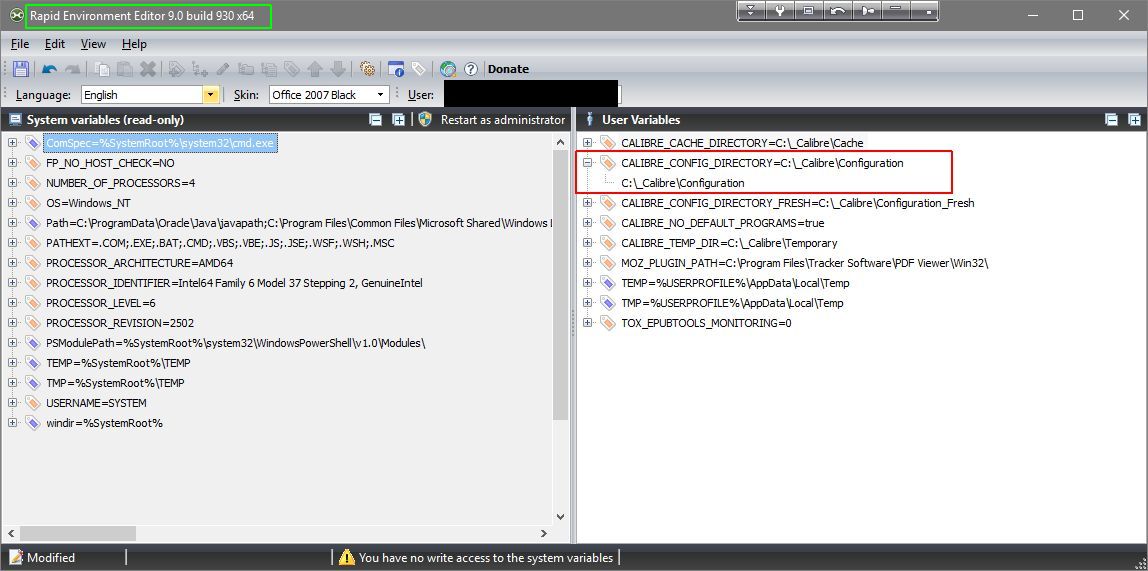 First create a new directory for your test and then change the line setx c:\Users\YOUR_USER_NAME\Documents\Calibre\Calibre-Development\Developmentconfig\ in the first batch file to your needs. Keep in mind, if your directory name includes spaces like my directory, you need to use apostrophes like "my directory" Create the batch files with an editor like wordpad, notepad or any other editor (but not MS Word) and save the file with extension "bat" (like set_env.bat). The command pause waits for any keyboard input. If you don't need it, add a REM at the beginning of the line like REM pause or simply delete the line. Usage: run first the "set_env.bat" then you can start calibre as usual and do your tests. After you had finished your test, close calibre (ctrl+q) and run the second batch file "del_env.bat". After this calibre will run with the default directory again. Good luck! |