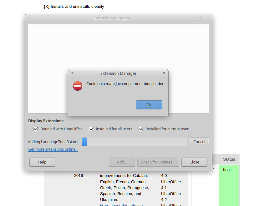 I tried LO and didn't notice a grammar checker so I went to the Extensions Manager and there it was so I enabled it, but then I got this window (160). I clicked Okay. When I did, the window popped up twice more and I clicked okay twice more. Which brought me back to the Extension Manager (161) and when I clicked "Enable" I just got the same error as previously. Quote: