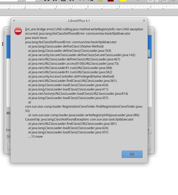 sudo apt-get install default-jre After the JRE installation you'll need to check the “Use a Java runtime environment” in LibreOffice. |
