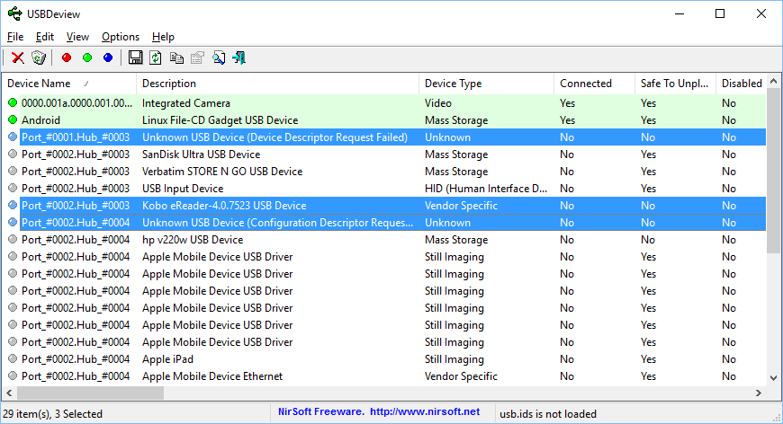 No new devices show up in USBDeview when plugging in the Kobo.