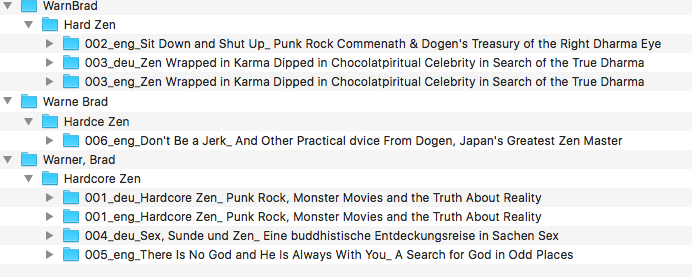 In your file overview you have the same author in different spelling (WarnBrad, Warne Brad and Warner, Brad). You maybe export the wrong written author name before you correct the names. Delete first the older exports. When it happen again, you need again check your library for double entries (e.g. sorting by name/title or series will help to find theses entries).
