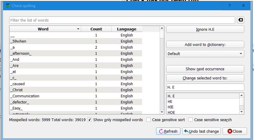 But I think you've helped identify a bug. With "Show only misspelled words' checked, if you Ignore one word in the list, and then uncheck 'Show only misspelled words' the 'Misspelled' column for that word will show as "Ignored' However, if you Ignore multiple words with with "Show only misspelled words' checked (as I do with Proper Names), the words do not show as "Ignored' when 'Show only misspelled words' is unchecked. Yet those words don't appear when "Show only misspelled words" is re-checked ![]() BR |