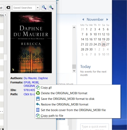 Yes, the book details pane is the one that appears to the right of the library list. EDIT: Sorry if this is labouring the obvious, but you don't right-click on the word "Formats", but on the name of the actual format you want to restore (eg "ORIGINAL_EPUB" or "ORIGINAL_MOBI"). Last edited by HarryT; 11-26-2016 at 06:22 AM. |