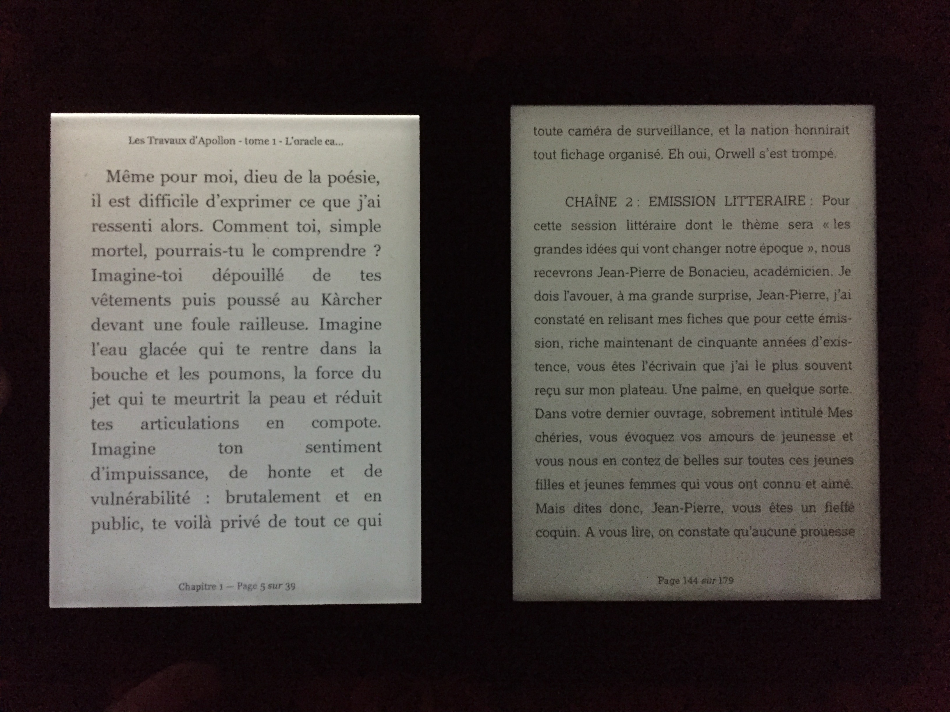 First picture was taken in the complete dark. Frontlight was set to 1% on Aura 1 and 2% on Aura 2. You can see Aura 1 is much brighter the Aura 2. 2nd and 3rd pictures were taken with low light. |