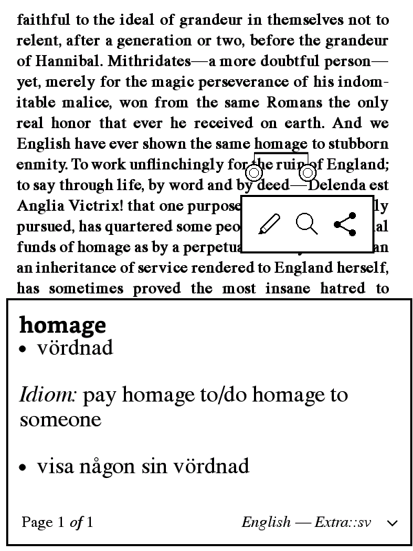 Hi, I've tried to get the same english-swedish dictionary to work on my Kobo aura one, but it really seems to translate into german language. In order to double check, I renamed it with the english-portugese (dicthtlm-en-pt) and it really translayed into german. Did you actually find an en-swe one that worked? Witch one? Any tips??