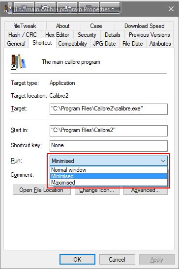 As you probably know, on Windows, programs are normally started from 'program shortcuts'. These are small files with the extension .LNK. I believe the OSX equivalent of a Windows shortcut is an ALIAS file. Windows shortcut files have a Run property (attribute) which specifies the state of the program's main window when it starts, viz: If I set the Run property of calibre's taskbar shortcut to 'Minimised' and then click on it, the calibre window is not seen (I have the splash screen turned off). If I wait until calibre's taskbar icon highlights (a moment or two) and then click on it again, it immediately opens to the last used state in terms of size and position, so the resize and reposition must happen whilst it's in a minimised state. Perhaps OSX ALIAS files have something similar to the Windows Shortcut file Run property that you could experiment with. BR BTW I don't click on taskbar icons, I use Winkey+keyboard shortcuts to select them and Enter to action them. Last edited by BetterRed; 12-27-2016 at 03:20 AM. |