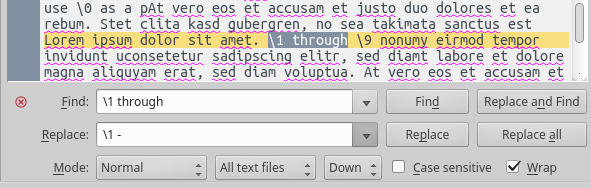 also when searching for REGEX controls they need to be escaped: \\1 through \. \. \. and there may be a bug as I would have expected 'Not Found' instead of a crash |