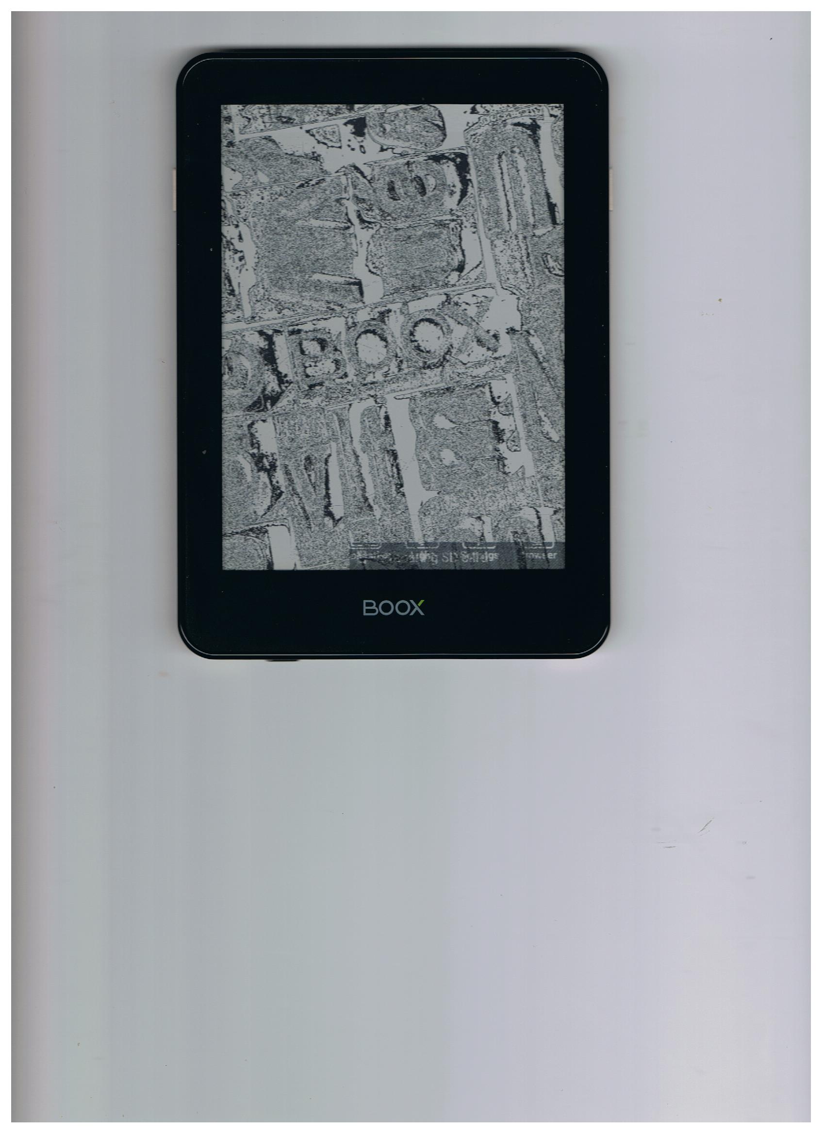 They show respectively, the screen (i) in sleep mode, (ii) just out of sleep mode & (iii) when first started up. I also was able to present them with a (rather hurried and thus blurred) pic of the initial "BOOX READER" screen showing at full contrast (meaning that neither the screen, nor the most basic OS is damaged).
