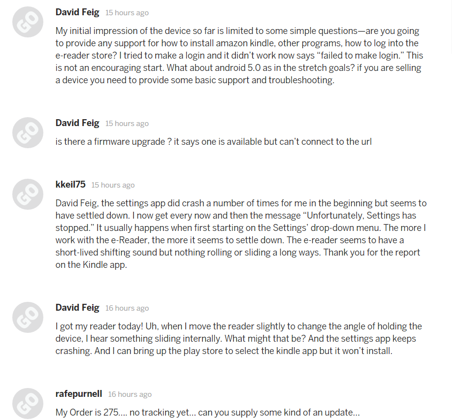 They have been busy deleting posts on their 13.3" Indiegogo page again. And they no longer seem to link to their Indiegogo page from their website. They also have announced that the 6.8" device will be launched on Kickstarter, not on Indiegogo. All very curious. Backer/Buyer beware. |