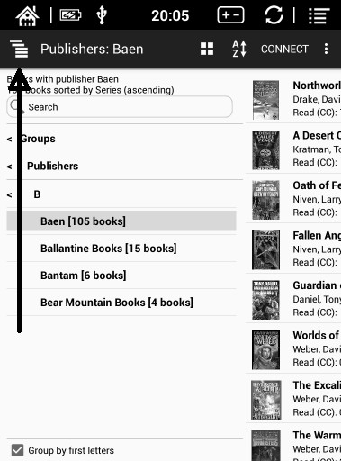 I have two e-ink devices, an Afterglow 2 and an Energi Systems eReader Pro +. Opening the grouping drawer using the icon on the action bar looks fine on both of them, with the drawer opening in a single e-ink repaint. Using the flashing grouping drawer buttons is much worse, but you should turn those buttons off on an e-ink device. Swiping to open also looks worse than tapping the icon. The attached screen capture from my Afterglow 2 shows the icon I am talking about.