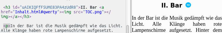 Click on II. Bar opens the chapter concerned. II. Bar (ToC) Click on How I insert in the list Inhalt (means Content or ToC) for hundreds of items (headings) different ID's? Inserting identical ID's with S&R is easy, but no possibility (produce error message Dublicate id). By the way: How is to manage the size of images (in mobileread forum)? Last edited by chaot; 01-27-2017 at 03:30 PM. |