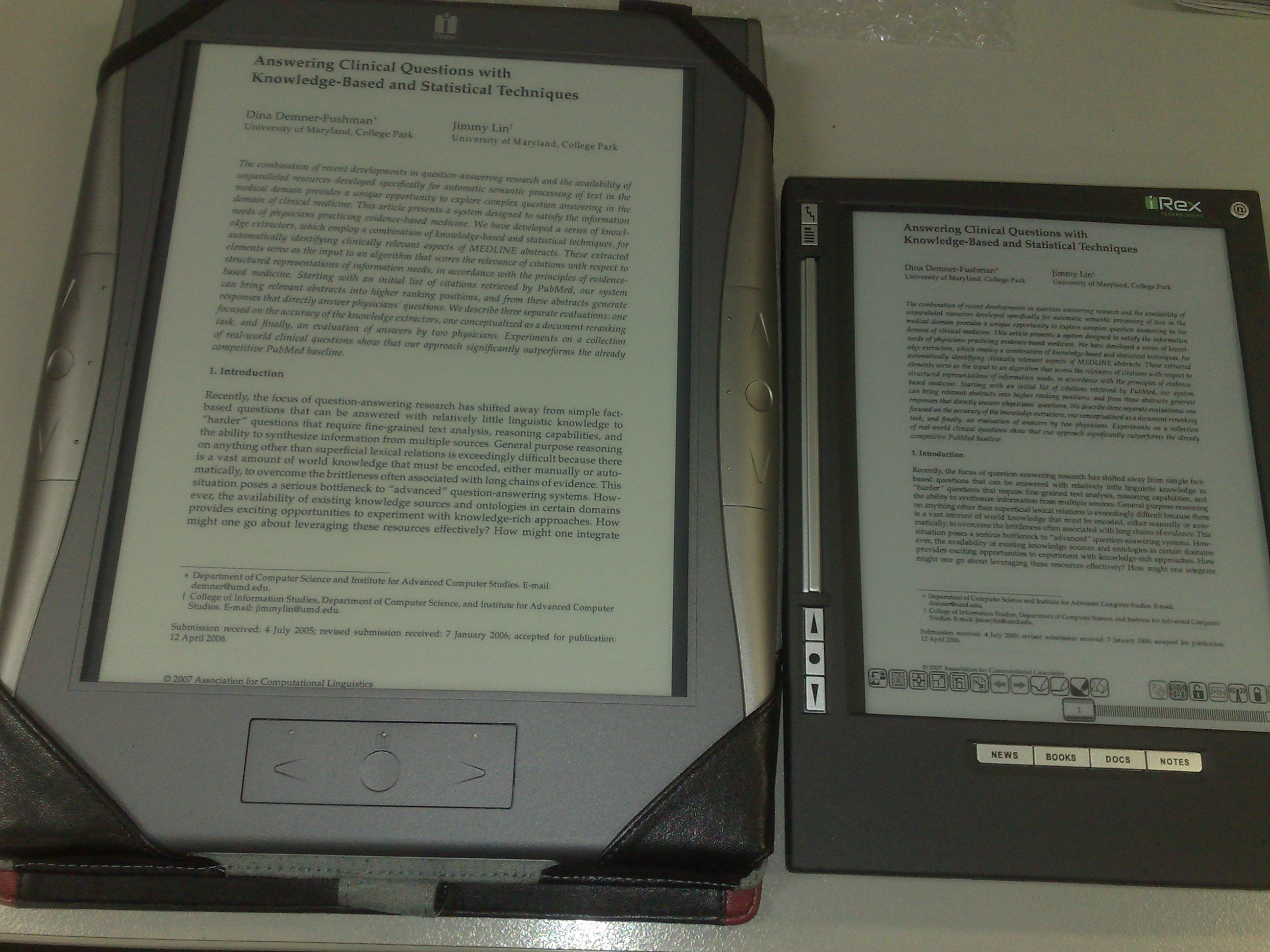 Both files are perfectly clear and readable on the DR1000S. Page turns take approx 1 second each (running the new firmware - its great!) Click 3 times on each thumbnail to view the photo more clearly. Last edited by cbell; 02-09-2009 at 12:56 AM. Reason: iRex DR1000S on left, iLiad on right |