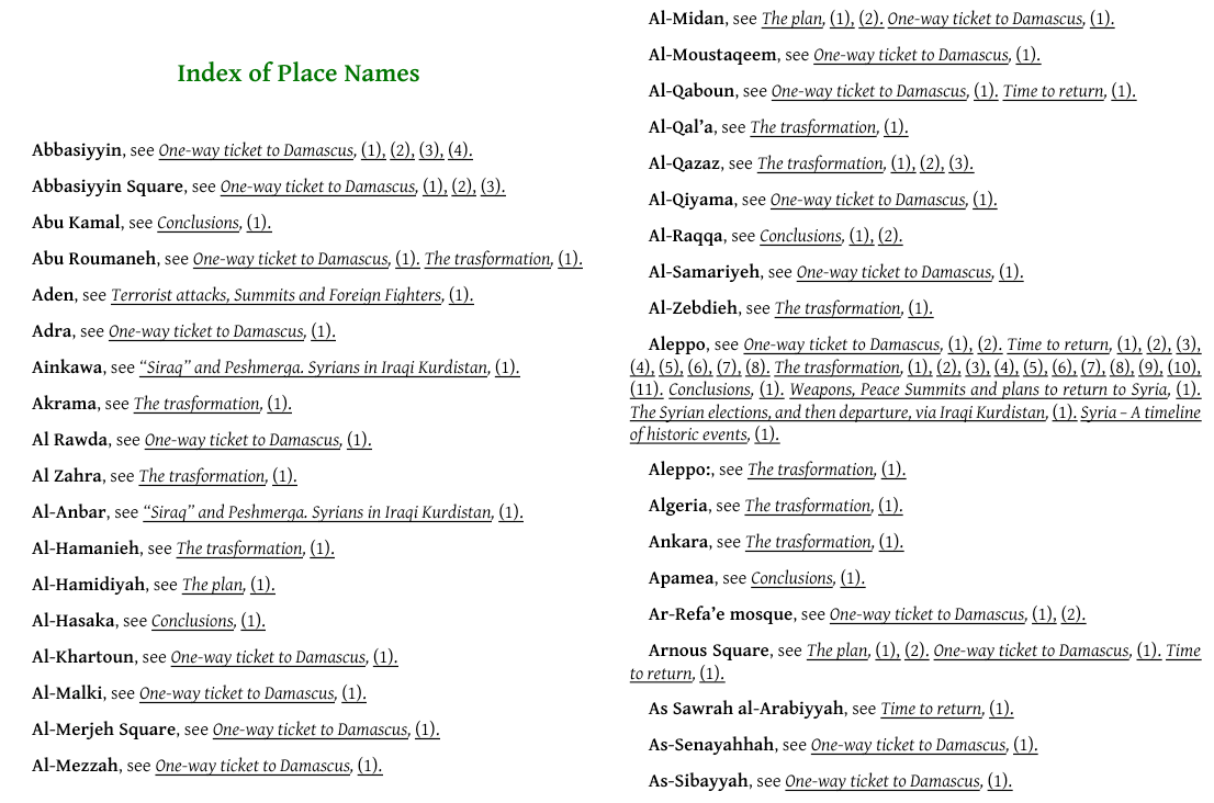 Hi, I usually create Indexes like the one I attach (a screenshot from "Syria Calling" ePub). I think this is a good way to allow reader to follow link inside the ebook and have a way to differentiate the multiple instances of a word inside a single chapter.