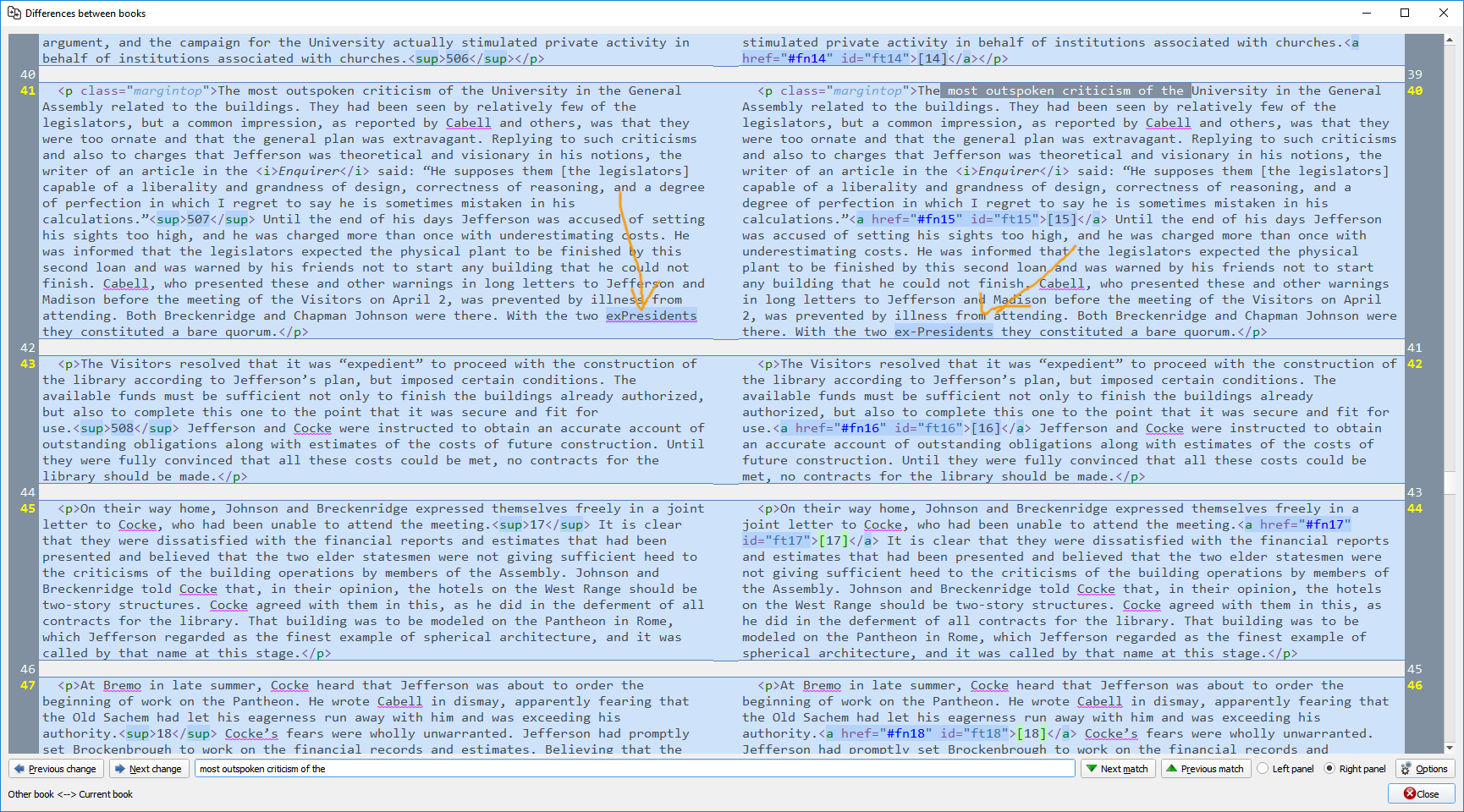 https://manual.calibre-ebook.com/diff.html Open up your EPUB in Calibre's Editor, then press File > Compare to another book, and choose the one you want to compare to. EPUBs are just HTML files in a ZIP file. You can just unzip the EPUB and use all the different Code Comparison programs to compare files: https://en.wikipedia.org/wiki/Compar...mparison_tools and there are probably quite a few online code comparison tools. I personally use/prefer Beyond Compare (Paid, proprietary): http://www.scootersoftware.com/ I found it worked better than the other tools I tested. (Working on large Non-Fiction books with large paragraphs.) Some other tools I tested misaligned very easily, and the entire comparison algorithm would get thrown off beyond that point. If you are working on something like Fiction with shorter paragraphs, those other tools may work absolutely perfectly for you. Last edited by Tex2002ans; 02-22-2017 at 02:50 AM. |