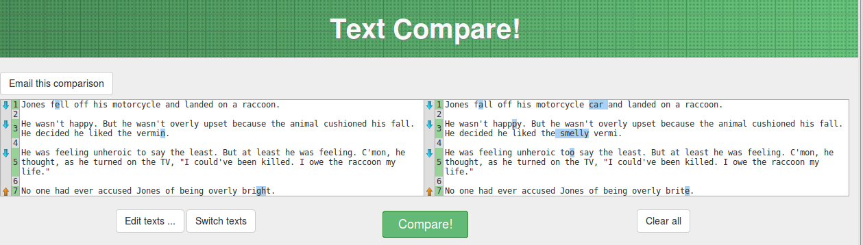 For the conversion from epub to txt I used this online converter: www.epubconverter.com/epub-to-txt-converter/ Super fast and accurate. For comparison I like this online tool. https://text-compare.com/ Super precise and it has a 'next change' option (in between the compared texts) which really helps with a huge bunch of text. The screenshot is kind of cluttered but you get the idea. |