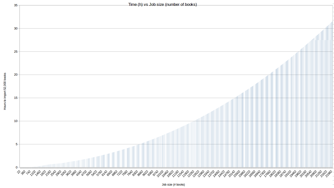To find out in how many jobs I should divide the big job, I make the following chart, it shows how many hours i will use for 52,000 books depending on the the book count of the small jobs: