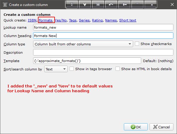 I would create a new column thus: Assuming it's OK, delete the existing 'formats' column, and rename the new one as required. The approximate_formats() template function reflects the formats whose existence is recorded in the database, before that function was added (quite some time back) displaying formats in the book list was cumbersome. Might be worth running the Library maintenance->Check library function, the 3rd pass will report on discrepancies between what format files the database has recorded and what format files actually exist. BR |