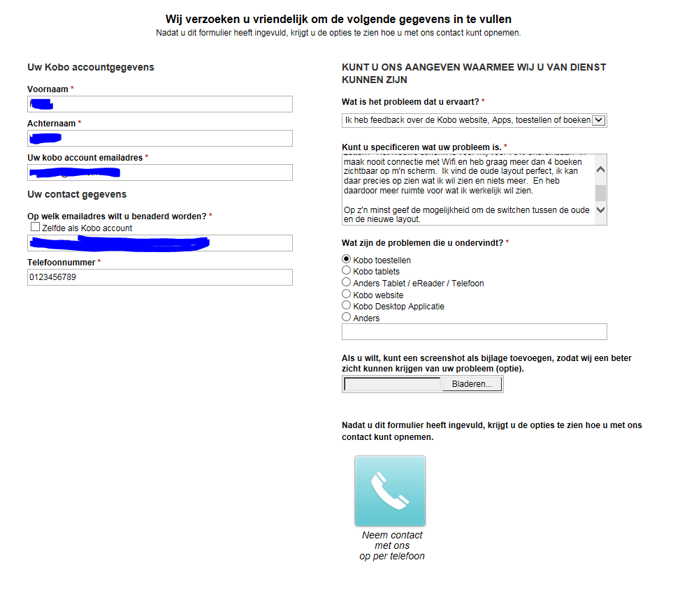 The linked page has a large link for "Contact Kobo Customer Care". Clicking that opens a page to select a country. Clicking the country goes to a "bad web form".