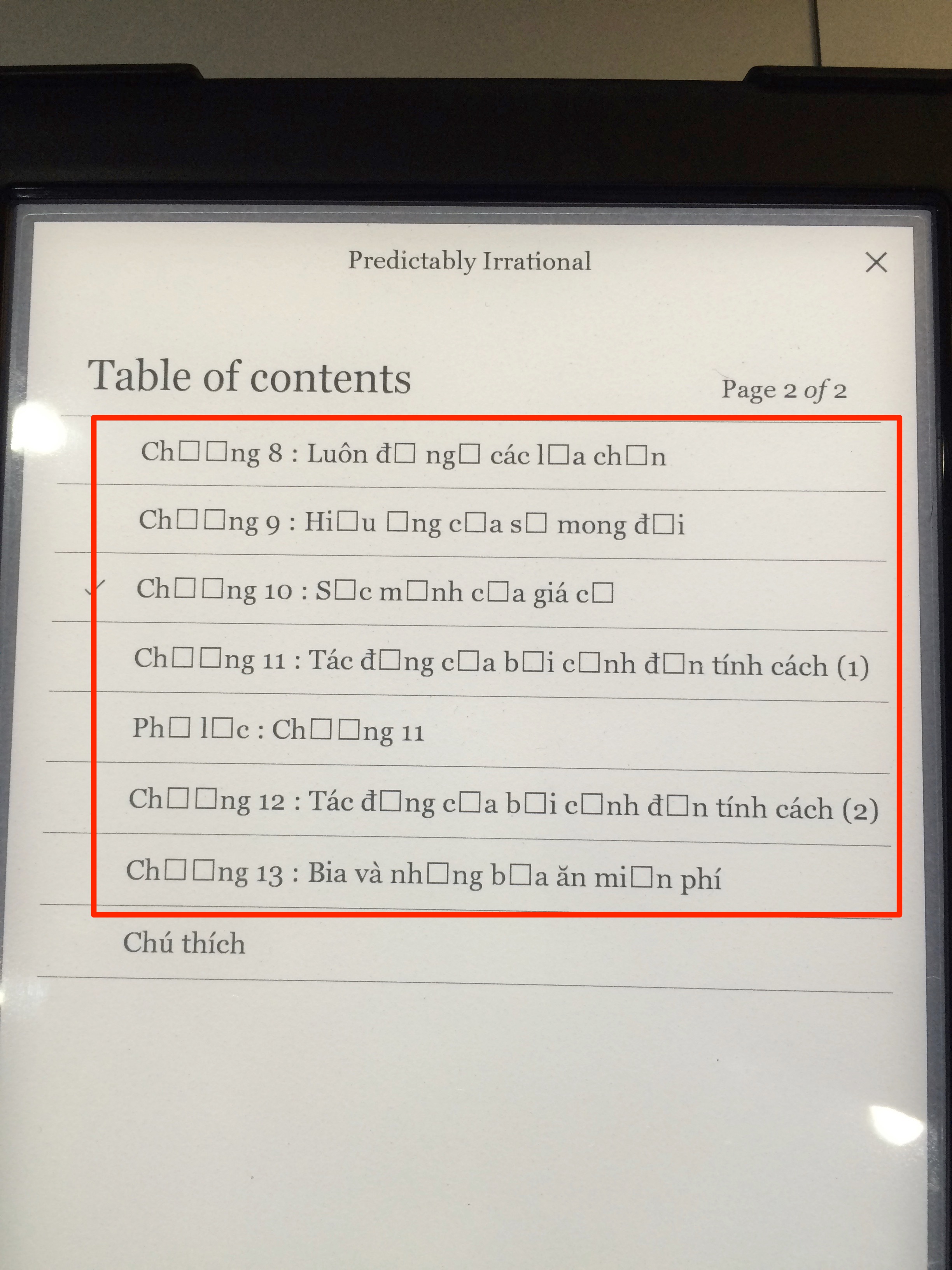 Can you give me link instructions? Because I have not found your instructions yet. I am using the latest firmware 4.3.8966 on the Kobo Glo HD. In the attached file is a Vietnamese book. You can check it. I often read with Bookerly font, because it supports Vietnamese, so I also attach to you can check. As I said in the previous comment, I can read the contents of this book, but other parts, such as book titles, TOC (table of contents) do not display correctly. Again, thank you very much. EDITED: Remove book and fonts Last edited by ntson; 03-29-2017 at 11:40 PM. |