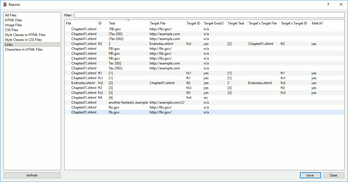 What would help (assuming it's possible) is a facility to filter by 'link purpose' - i.e. endnotes, references, index entry, toc entry, image reference, etc. My primary concerns are endnotes and references, if the book has an extensive index they tend to get swamped by the index entries. The endnote, reference and index entries in some of my texts span multiple xhtml files.