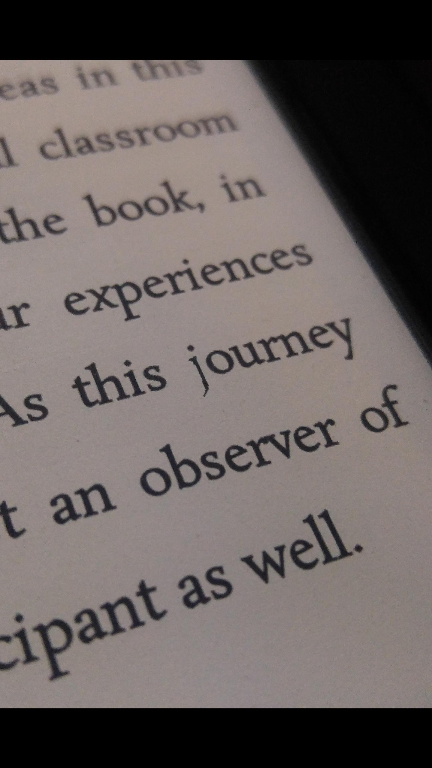 Edit: In the second set of photos you added it might be okay, it is just hard to tell how large the font size is without seeing the whole screen in the photo. If that is a very small font size with a high sharpness setting then it is probably okay. It is really the second photo of the first set that looks strange. I've attached screenshots from my Glo for comparison, this is in the ePub reader with weight/sharpness at the default settings. (see word 'just' at bottom right.) Last edited by GeoffR; 04-07-2017 at 11:33 AM. Reason: Added 2nd screenshot |