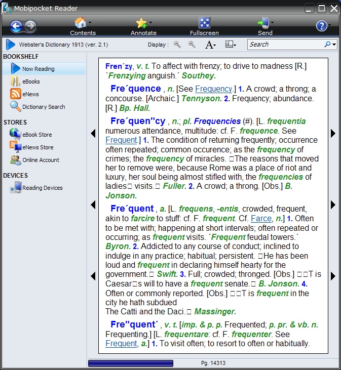 Now, some html codes for curly quotes and apostrophes are "gone" i.e. so little boxes! I was upgrading my Webster's Dictionary 1913 (ver 2.1) and noticed that the same html code renders differently (see below images) from the ver 2.0 Dictionary I posted earlier. The ver 2.0 ebook appears find in the updated Mobipocket Reader.