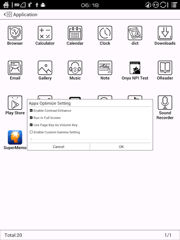 Here it is picture by picture: 1. Launch the default onyx launcher, go to Applications. Long tap on some application, I did this here on "SuperMemo", until the pop-up menu appears: 2. Choose the "App Optimize Settings": Whatever you choose it will always be applied to that application no matter what launcher you are using. You seems to be unhappy with the defaults applied by your e-reader. It has nothing to do with a launcher application. It is specific Onyx extension. |