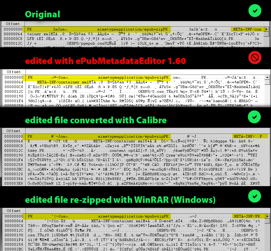 - Lastly, I imported & exported "your" epub file using Calibre. Then I compared all the headers in a hex editor (WinHex).