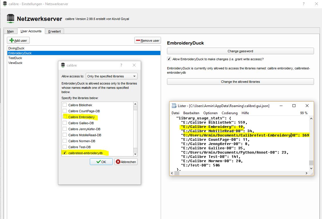 2) please forget this one. My fault. As I recognize now, that was a mistake within that library. (PDF-Dokument, first page blank ...). Seems, I will have to validate this library. Sorry for this. 3.b) The last yellow marked librara called "calibretest-embroiderydb" is called actual "CalibreTest-EmbroideryDB". I need to check this once more. Maybe this have to do with the first beta. Maybe that will only change, if I delete all users with access to the library. I will come back on this after a new test later today. 3.c) Maybe a bad description from my side. I meant as additional (path) info within GUI (pic2) where I set the library access for a user, not Web-GUI. 4. I will work around that. The question came up because this file is the only one I have with readable PW's in a DB. 5. Then I need to deal with it