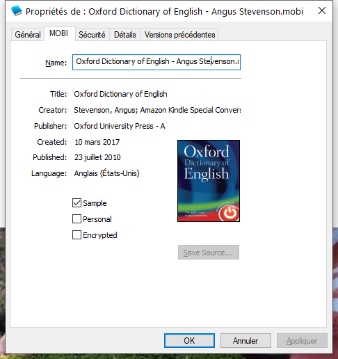 On a (mobi7) book obtained from Kindle for PC v1.26, Windows 10 shows