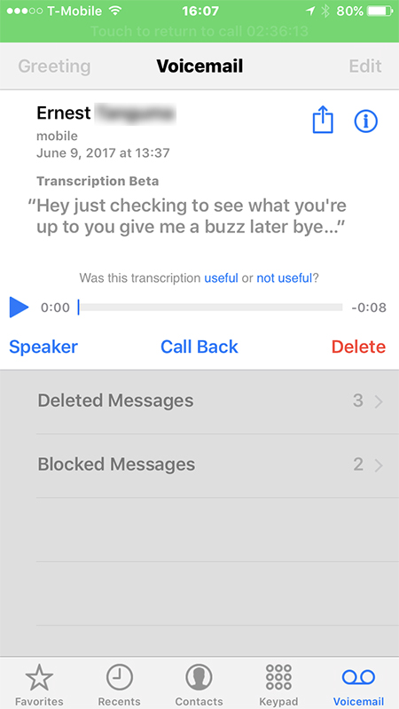 I'm probably the last one to notice this, but I had a voice message on my iPhone this morning and set out to listen to it. Then I noticed that on the page with the voice message controls, the message was transcribed during playback on the speaker. Pretty cool! It does say "Transcription Beta" at the top, so maybe it is a new feature.