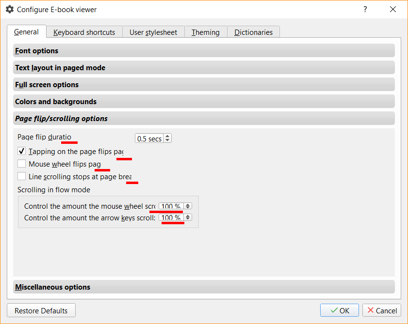 In the calibre book viewer settings the text is cut in the page flip/scrolling options.