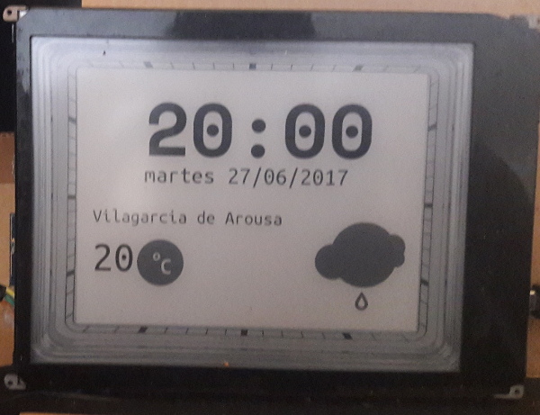 Sadly, it isn't ready for distribution yet. Sharing the source wouldn't be useful without refactoring and I don't remember where I got the icons so I don't know if I'm allowed to bundle them with the software. Right now it looks like this: The clock is displayed always, and updated each minute with partial refresh on the e-ink screen. The weather panel is displayed when we got the weather info from the internet (which happens at boot and each hour o-clock since booting. The weather panel is updated only when the information changes, which happens once or twice a day. To avoid ghosting a full update of the e-ink screen is triggered each 15 minutes. |