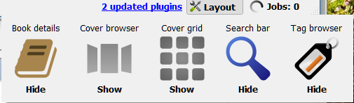 Kovid accepted a patch to add an option to show the buttons instead of the layout button. If the option Preferences / Look & Feel is checked then the calibre status bar looks like the image below. The order of the buttons can change depending on which of a "wide" or "narrow" global layout is selected.