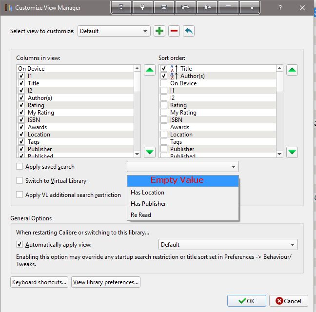 Perhaps the check boxes should be after the selectors and only enabled if there is something in the corresponding selector. The check boxes and selectors have the same tooltip e.g. "Switch to the selected Virtual Library when the View is activated.". I suggest the check box tooltips have something like "Enable/disable switching to the selected Virtual Library when this View is selected" -- If two widgets have the same tooltip it begs the question, why are there two widgets ![]() BR Last edited by BetterRed; 06-19-2017 at 06:54 AM. |