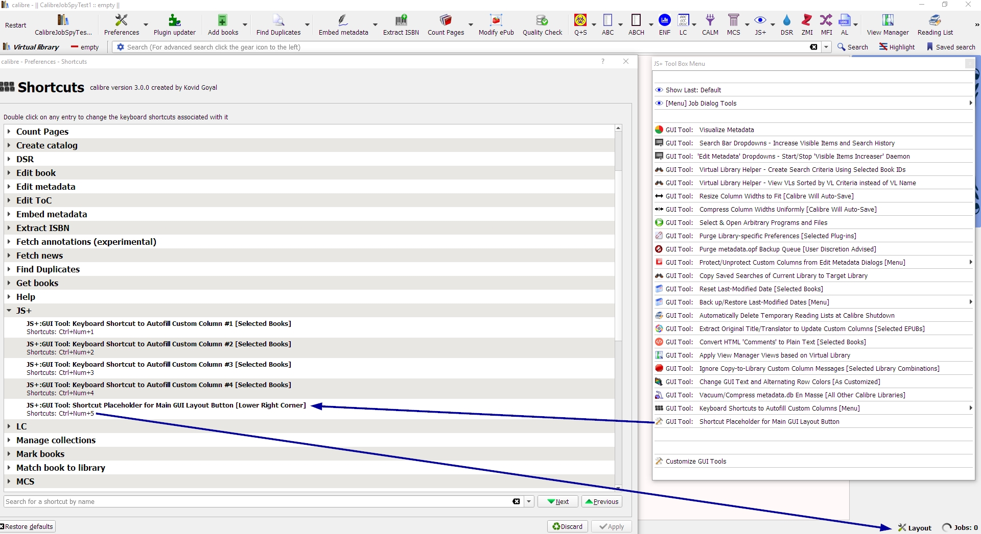 Version 1.0.59 -2017-06-19 New GUI Tool: Shortcut Placeholder for Main GUI Layout Button [Lower Right Corner]. Calibre 3.0.0 and higher only.