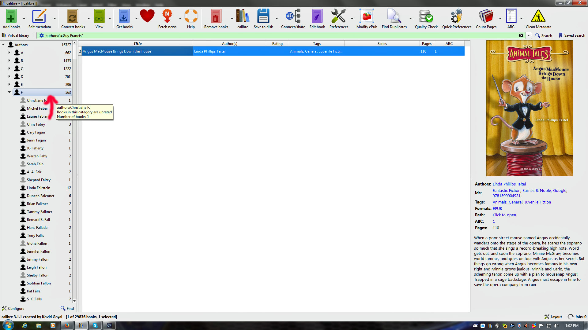 While using the tag browser I'm having problems with the focus of the location on the tag browser when changing authors names or deleting their books. When I make any changes of an author's name that has 1 or more books, such as, when I swap an author's LN FN to FN LN (using Quality Check) on all their books or delete all of an author's books (1 or many) using any version of Calibre 3 so far; the focus jumps to the top of the authors list. NOTE: While typing this, I'm doing more testing to make the attached pictures. I'm finding that if the name in the list no longer appears as it was (i.e. LN FN to FN LN) the focus jumps to the top of the list. This happens even if the changed books of the author combines with other books of the same author in the list. When doing any of these actions in version 2.85.1 or earlier, I don't have these problems. The focus centers on the list at the location of the author being changed or where the author was if deleting all of their books. Now, all of these changes are being done inside of the booklist area. I change the author's name by clicking on the author(s) area of the booklist or highlighting the book(s) if using the QC button. Also, I remove all books of an author that I'm getting rid of by using CTRL A in the booklist and then using the Remove books button. Also, I'm using the 64bit version on Windows 7. Description of the attached pictures: These pictures are showing changes from version 2.85.1: Pic01 shows a LN FN that will be changed to FN LN in the list. Pic02 shows the results of using the Quality Check button. The changed name merges with the other book and the focus stays near the middle. Pic03 shows the author that I will remove. Pic04 shows that the removed authors place is now centered in the list. These pictures are showing changes from version 3.2.1: Pic05 shows a LN FN that will be changed to FN LN in the list. Pic06 shows the results of using the Quality Check button. The focus has jumped to the top of the Author tag list. Pic07 shows the changed author correctly but I had to scroll down to the location. Pic08 shows the author that I will remove. Pic09 shows that the focus has jumped to the top of the Author tag list. Last edited by BetterRed; 07-01-2017 at 01:38 AM. Reason: Moved the pictures in-line with the related text |