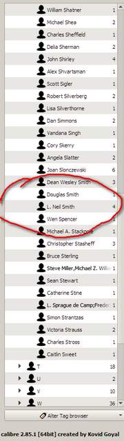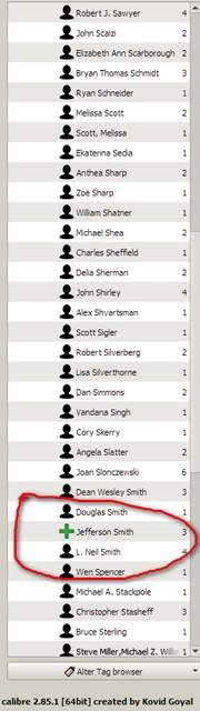 In an effort to help reconcile the differences between what the OP and Kovid say they are seeing, I added some pictorial evidence of what I see when I change an Author name in the Tag Browser. And to point out that if one peruses the Manage <whatever> list looking for apparent anomalies, as someone suggested, there is no easy way to see which books are categorised by a given value. Using a server task to browse the same library is hardly 'easy', especially if it's not already running. When I was setting up my library, I identified anomalies by perusing <category> CSVs that I obtained from the database, I corrected them in the book list via F2 cell editing. BR |