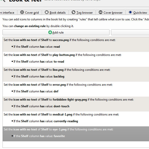 I've added a dozen rules for custom icons. 5 icons for 1-5 star ratings. Then 7 icons for different shelf values. My library is around 18k books. After adding the icon rules, there's a huge performance hit. Scrolling through the list of books is very very slow and thus laggy. I've tried using from 512x512 icons to 32x32 icons and it is still laggy. Regardless of icon pixels though, all the icons set total to 382kb, which isn't a lot. I've tried deleting the rules and the lag is gone. I've tried the icon rules on a smaller library of ~1000 books and the lag is still there, albeit not as laggy but still lags. So, just wondering if anyone has same problem and if there any tips to improve performance? Note: I don't think my computer (amd octocore and 16gb of ram with ssd) is that slow for adding 12 icons to the rules set, or is it? Attached a pic of icon rules and it seems pretty simple and not a lot, which I don't understand why it will lag so much. Last edited by moredrowsy; 07-09-2017 at 03:27 AM. |