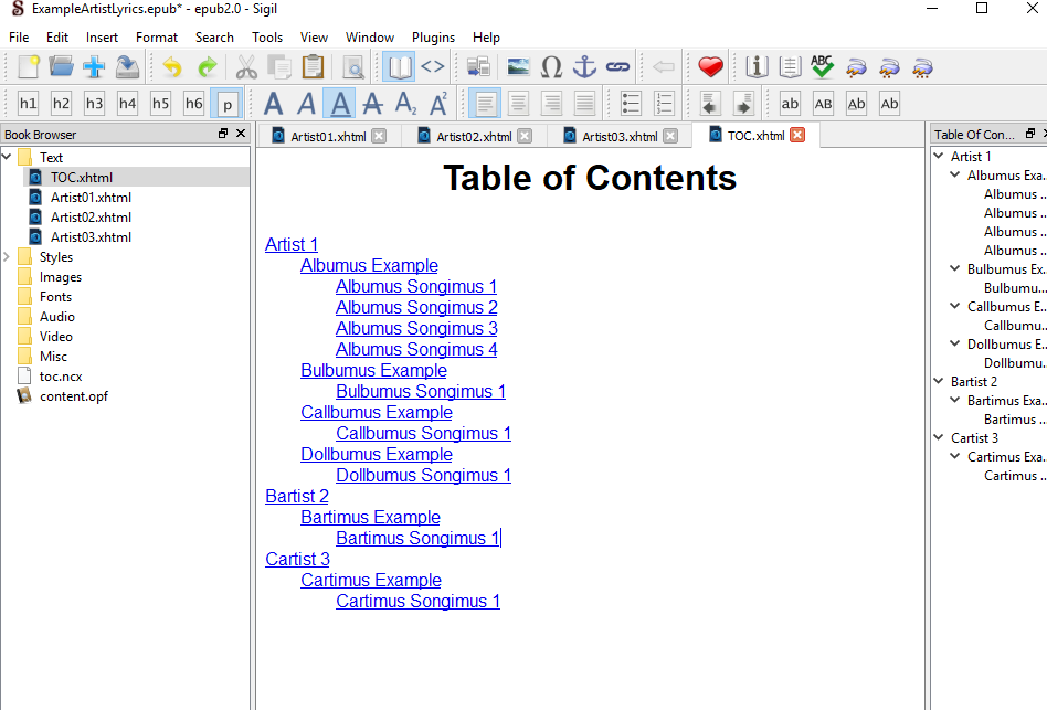 The use case is this: I have a library of song lyrics. I want to compound those in ebook of some sort. There are a lot of songs from different artists and albums. I created a simple structure in HTML where every h1 is the artist, h2 is the album and h3 is the song title. Then the song lyrics are in a PRE tag after. This is ordered by Artist/Album so it works out okay in the main TOC: I take only H1 tags and get a table of contents for authors. So far so good.