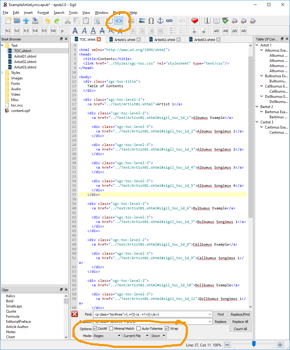 Warning If you mess up any of the Regex or Search/Replacing, when Sigil is trying to cleanup the leftover <div>s, it may remove important code. This is why you need to back up.