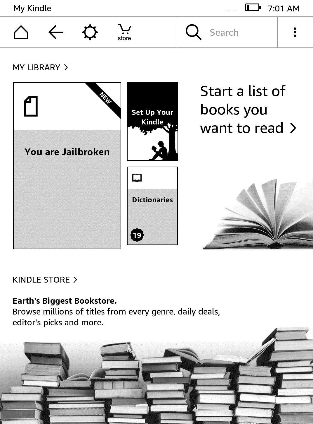 Specifically the: STOP HERE part of the second sentence. You will have to re-package the 'hotfix' update_*.bin file to recognize your model using KindleTool. Although KindleTool does not have your model built-in, it can be used to build a package for a model passed on its command line. Somebody here will help you with doing that if you have any problems doing it yourself. Do not update the Kindle away from the 'factory use only' firmware until you have installed the 'hotfix' package. Without the 'hotfix' package, any update will wipe out the jail break. You will have to re-package the KUAL booklet the same way. Also, any other package in an: update_*.bin format file name. Last edited by knc1; 07-20-2017 at 04:07 AM. |