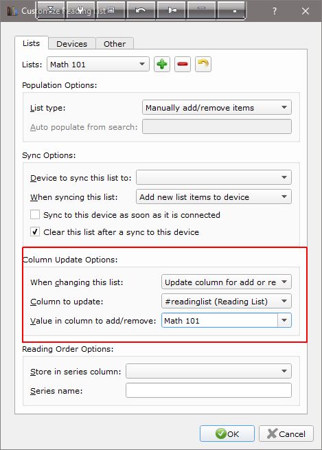 I created a column called Lists, then I imported a list from Goodreads with the plugin, then with the Reading Plugin I got all the books, and also the empty ones I don't have yet. Then, I went to the settings and just as you show in the preview I selected my list like you have Math 101, then I selected the #readinglist as you show too. And I typed on the value in column to add/remove the title of the List I want to add as you also have Math 101. I click ok and nothing happens. My "Lists" column is empty. Do I have to just mark every book in my list and just drag and drop them into the List column I created? But then it would be just these books from one list. I want the column list to drop down and have many lists I'm gonna create. Sorry and thanks in advance! |