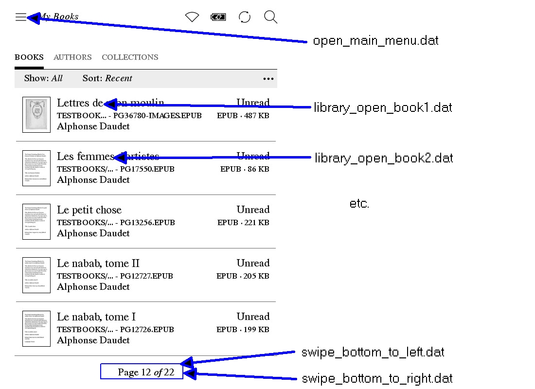 • It reads a text file that associates certain commands like "next page", "previous page" with the names of files that contain the appropriate recorded touch events.
