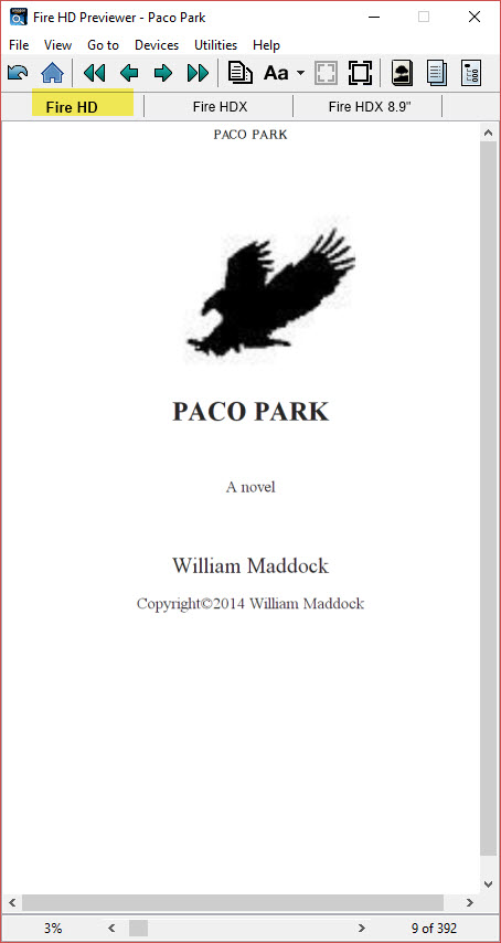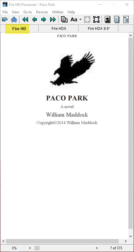 Your coding says, 50% of the width of the screen, which is the containing block because the Scrivener 5 class doesn't constrain the size; you use it to center the image, only (and provide top margin spacing). Right? Well, Wiliam, that Eagle damn sure ain't half the screen, in the DX. The DX is 824pixels wide, so this SHOULD be ~400px in width--and it's obviously not, given the original image is 90px wide. Is this what you're seeing, at your end? My best estimation is that the eagle is displaying slightly over its original size. Perhaps, 125-150% of its actual size. The KF8s all seem to be about right. Do we all agree on that? What am I missing? I mean that; we all know that I don't code daily, so I forget stuff. Freely admit it. What's working, in the DX screenshot? I mean, as it happens, the size of the Eagle image, on that screen, for that moment, works, even though it's not obeying the coding, but that's...coincidence. If it were, say, twice the size, it wouldn't. So: what do you think is happening here? To me, this isn't working. To me, it's displaying the image at just a bit over full-size. About 125-150pixels. Not half the size of the image, nor half the size of the screen. Hell, I don't know where it derived the size, unless we assume that like all images on KF7, the DX simply blew it up some percentage, attempting to make it fill the screen, as is KF7's wont. Anyone else have thoughts on this? I mean...if I'm not understanding what I'm seeing, I'm happy to hear them. Spoiler: