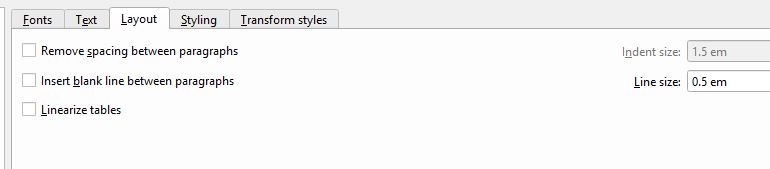 I could really use help with an .epub that is one large chapter with no .ncx table of contents. I want to split it into several chapters, and create a .ncx table of contents. I converted it in Calibre from .EPUB to .EPUB, and it made the chapters and the TOC, but the fonts and the layouts were changed. Is there any way to convert the file, but make no changes to the layouts and fonts? I Disabled font size rescaling, embedded all fonts, expanded CSS (see attachments). Should I use any other options? Is there a way to split a file or create a .ncx toc without conversion?