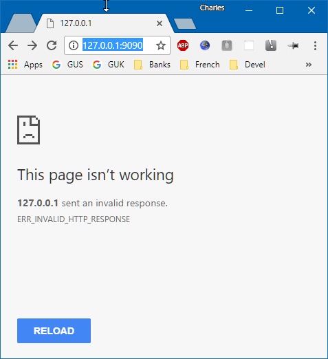 If on your laptop in a web browser you connect to 127.0.0.1:9090 you should see something like the following (I am using Chrome). Note the "invalid response".