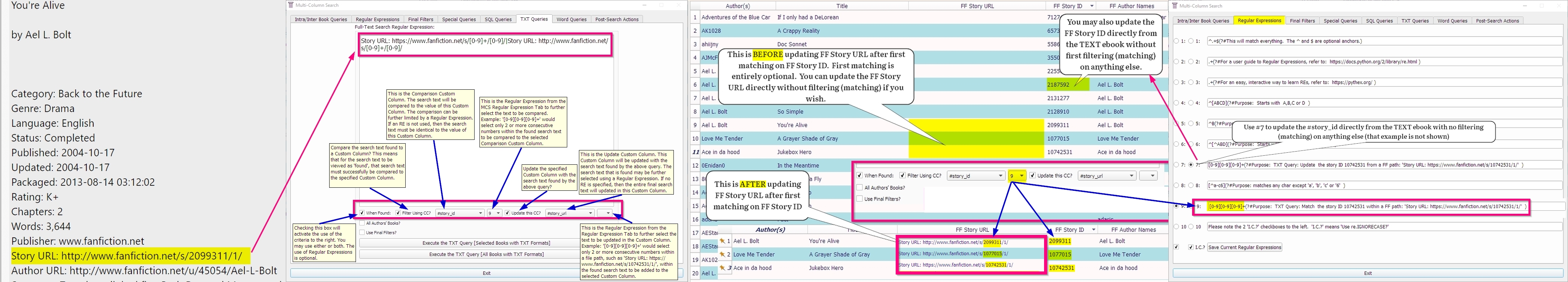 Option to additionally compare the initial search results to the value in a specified Custom Column (i.e., filter them), optionally using a Regular Expression to more precisely filter the initial search results text. Another new option to update a Custom Column using the initial search results after (optionally) further refining the search results text to be updated by using a Regular expression. These 2 options may be used separately or simultaneously. Refer to the ToolTips in the MCS Full-Text Query Tab. See the attached set of images for a Fan Fiction example having more detailed explanations. DaltonST |