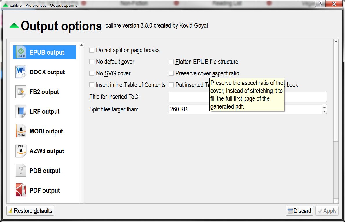 Thanks for the quick respons. I had no idee that the Modify Epub plugin had anything to do with the epub output options. The help balloon on that subject tells me it has to do with generating PDF files.